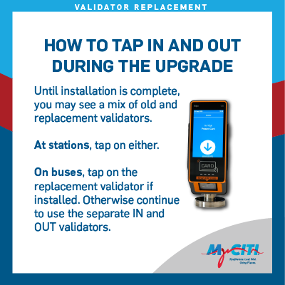 - At stations, continue to tap in and tap out on any old validator or replacement validator in order to enter or exit.
