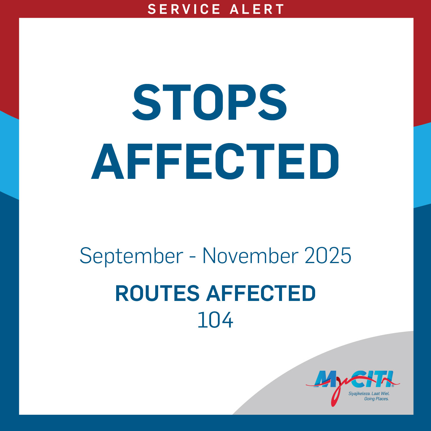 Passengers are advised that the Nobel Square stop on route 104 will be temporarily moved adjacent to the Water Shed complex from Monday 1 September 2025 until the end of November - weather permitting. This is due to construction in the area.