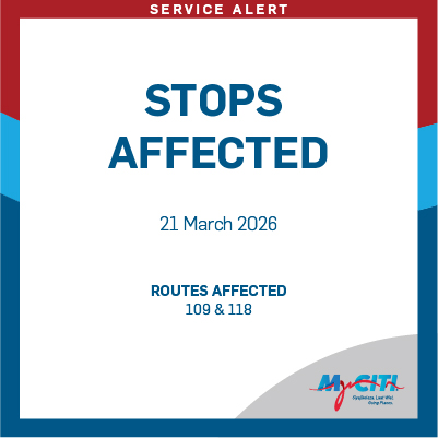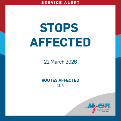 Stops affected toward Civic Centre: Cassel, Sea Point Pool, Boat Bay, Graaf’s Pool, London, Promenade & Rocklands will be skipped in the direction of Civic Centre